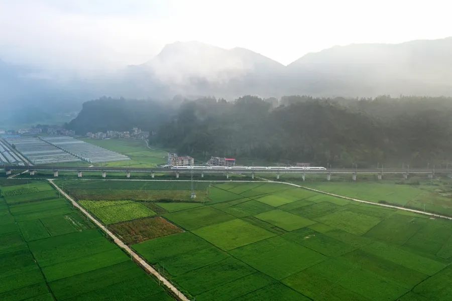 8月10日清晨,列车行驶在黔张常铁路龙山县茅坪乡水沙坪段。