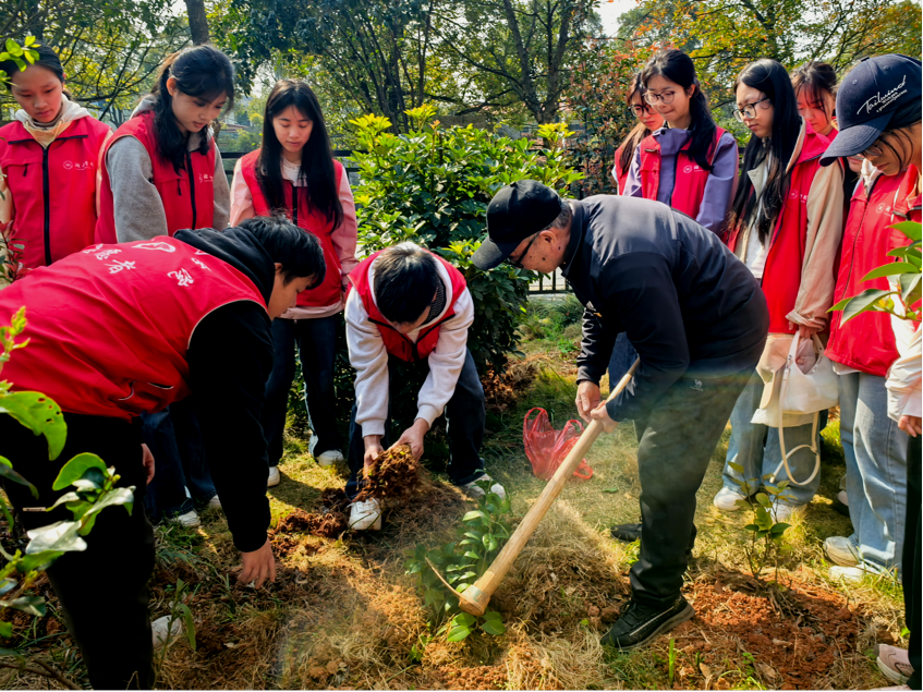 在“愚园”内,他躬身示范挖坑、培土、扶苗、浇水等规范流程。同学们分组协作、亲手栽种,合力栽下山茶花树苗,认真种植麦冬草,在劳动中体悟养护生命的意义。