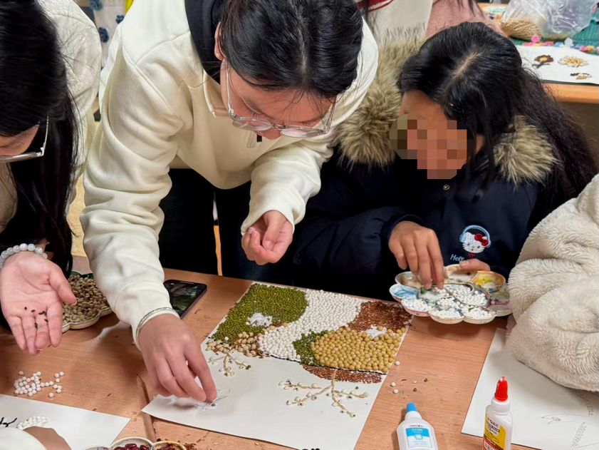 活动现场氛围温馨而热烈。志愿者们分成小组,采用“一对一”或“一对二”的耐心陪伴方式,与孩子们围坐在一起。他们首先示范如何将不同颜色的谷物巧妙地排列组合,形成生动的图案。在志愿者的鼓励和协助下,特教学生小心翼翼地将一粒粒饱满的谷物粘贴在画纸上,让春意盎然的春日风景在五谷的拼接中鲜活呈现。创作过程中,特教学生不仅锻炼了手眼协调能力和精细动作,更在触摸、分辨、排列不同谷物的过程中,获得了丰富的感官刺激和认知体验,脸上洋溢着自豪与满足的笑容。
