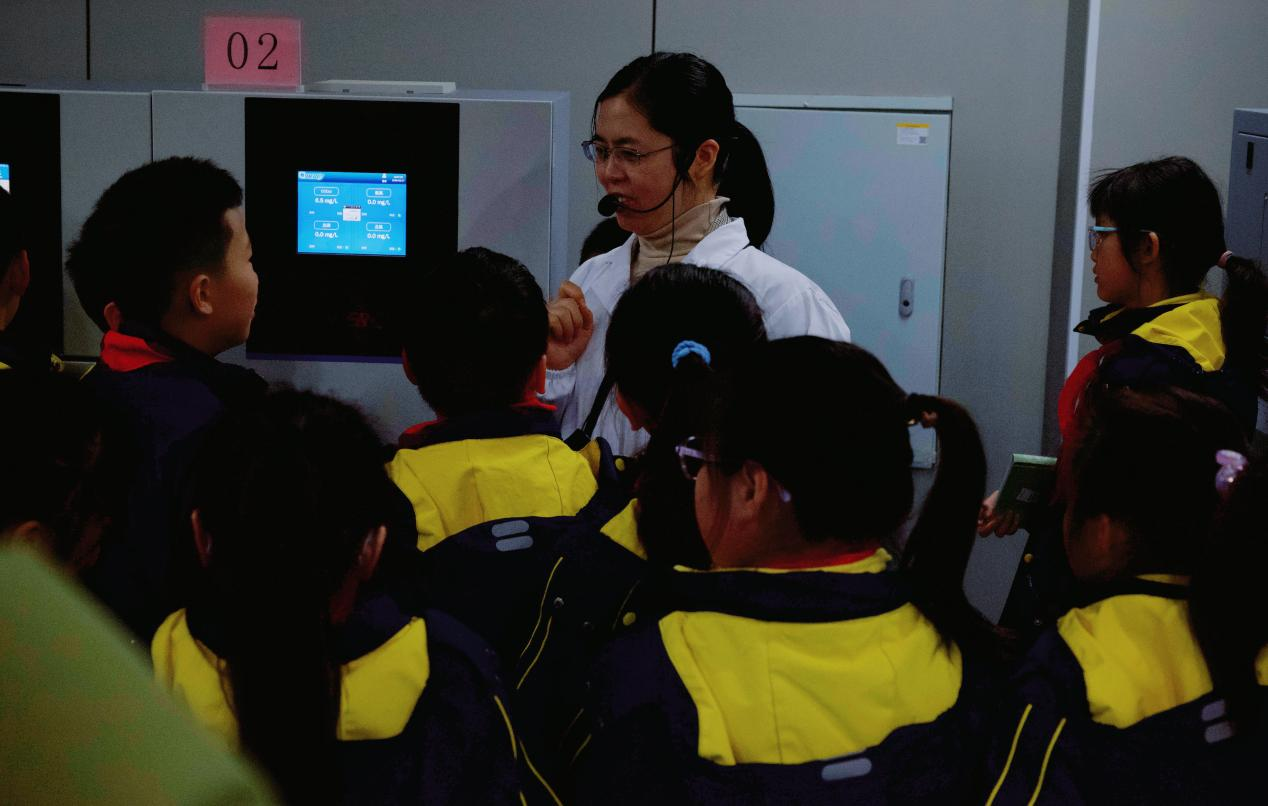 在科普讲解员的带领下,孩子们开启了第一站探索。“环境监测技术人员就像地球的‘精准体检员’,用专业仪器测量空气、水质、土壤指标,精准找出污染源头;生态环境大数据分析人员则是‘智慧分析师’,通过分析海量数据精准发掘污染规律,提前预警环境风险……”讲解员将生活污水处理、大气污染防治、固体废物处理、新能源等科学知识与环保职业角色巧妙结合,生动勾勒出“体检、治疗、康复”的环保工作全链条。孩子们目不转睛,惊叹道:“原来保护环境有这么多不同的职业!”科普的火花,点燃了职业启蒙的第一簇火种。