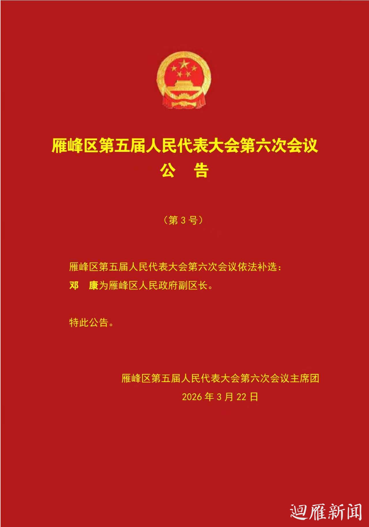 雁峰区第五届人民代表大会第六次会议公告(第3号)