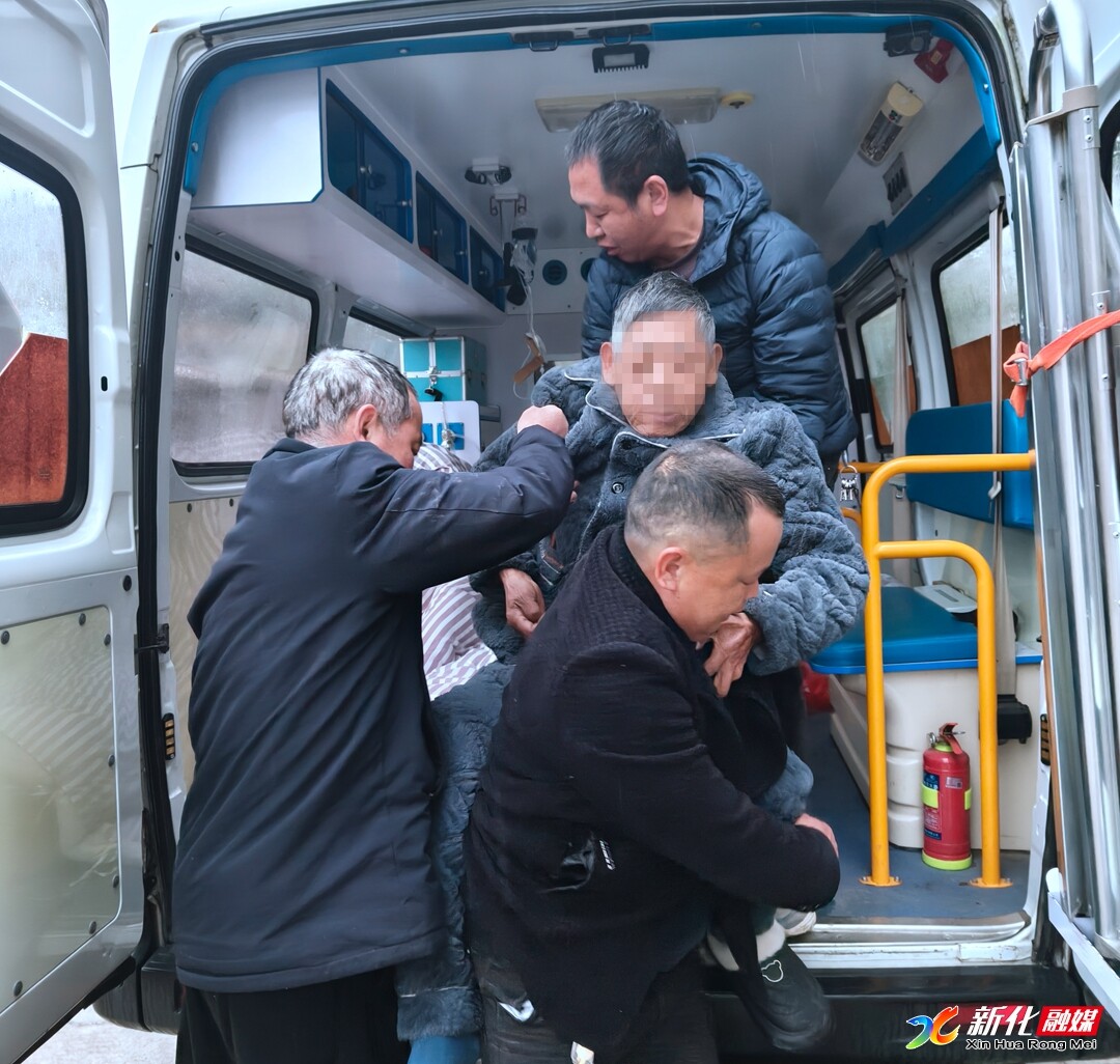 社区立即组织4名志愿者赶赴老人家中,多次敲门无人应答,志愿者果断破门而入,只见康某初躺在床上面色惨白、呼吸微弱,早已失去自主求助能力,床边水杯、手机散落一地。志愿者分工协作,一边拨打120急救电话,一边安抚老人情绪、帮忙穿戴衣物。经医生诊断,康某初为重度脑梗,需立即转往娄底中心医院救治。