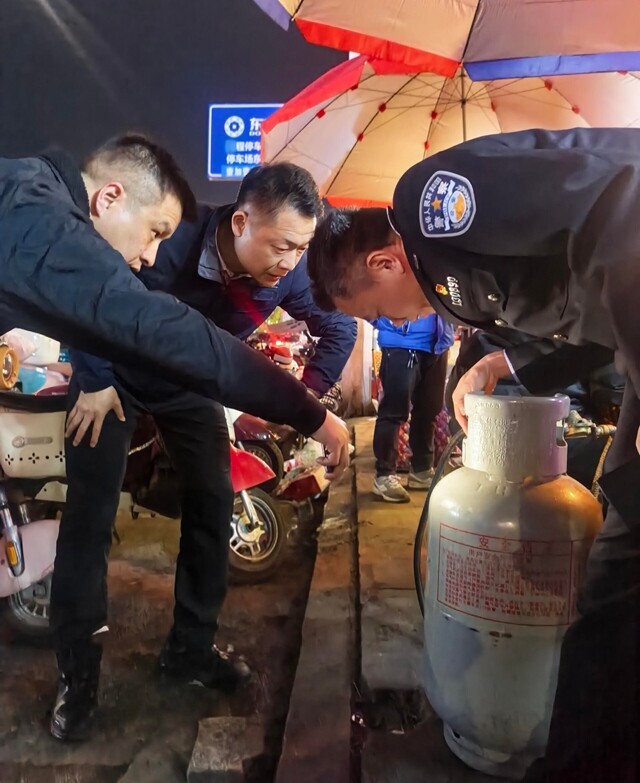 (沿街仔细查看摊点燃气、用电安全等情况)