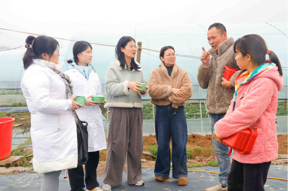 在小晴家庭农场草莓采摘园,团队与种植户进行了深入交流,详细了解草莓种植过程中的土壤肥力管理、施肥痛点及作物生长情况。针对草莓、圣女果等作物的科学施肥技术,同学们结合专业知识现场进行讲解和指导。团队还向农户介绍了自主研发的土壤检测试剂盒,并结合“AI土郎中”智能诊断系统,直观展示土壤养分状况,帮助农户理解“测土配方施肥”的科学理念与实际操作路径。农户们对土壤检测表现出浓厚兴趣,纷纷表示愿意通过检测掌握土地“健康状况”,实现因地施肥、精准管理,从而提升作物产量与品质。