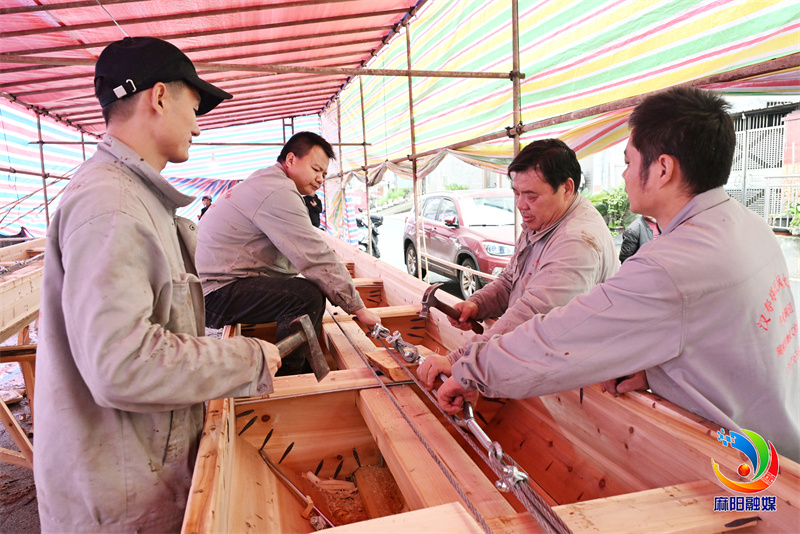 棚内,常德汉寿郑氏风火龙舟的9位师傅正分秒必争。一人牵绳固定,一人抡锤敲打螺丝,正进行船体拼装阶段的“巩固”工序,强化船体结构,防止变形。据龙南军师傅介绍,每支船从开料、选材到拼装制作需5至7天,师傅们从早上七点劳作到下午五六点。整体工程已过半,预计 4 月中旬完成全部 8 艘打造。