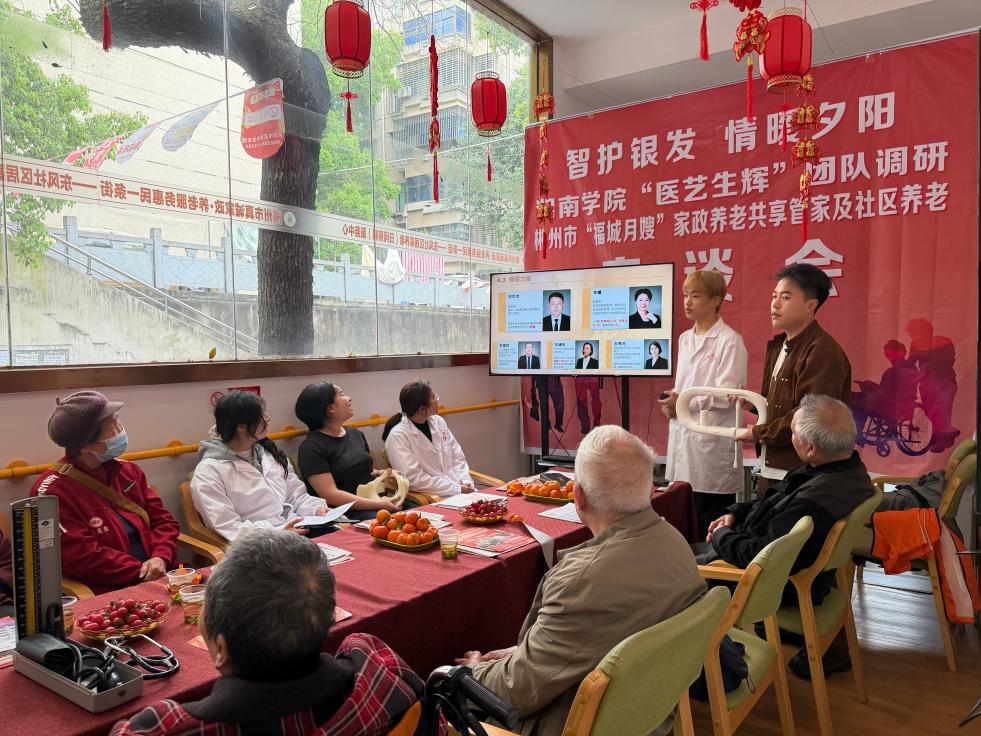 近日,湘南学院第一临床学院“医艺生辉”团队走进郴州市北湖区人民路街道东风社区,联合“福城月嫂”家政养老共享管家,开展“智护银发,情暖夕阳”主题调研与社区养老服务,以青春力量为老年群体送上专业关怀与温暖陪伴。