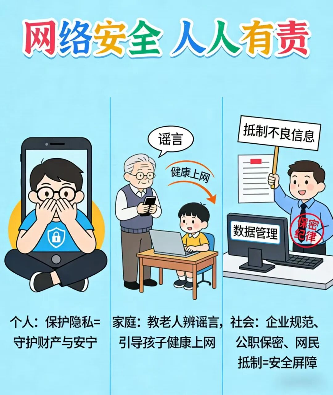 网络安全不是抽象概念,而是关乎每个人的民生安全:护好个人隐私,就是守护财产与安宁;教会家人安全上网,就是守护家庭平安;企业严管数据、人人规范用网,就是共筑社会安全屏障。