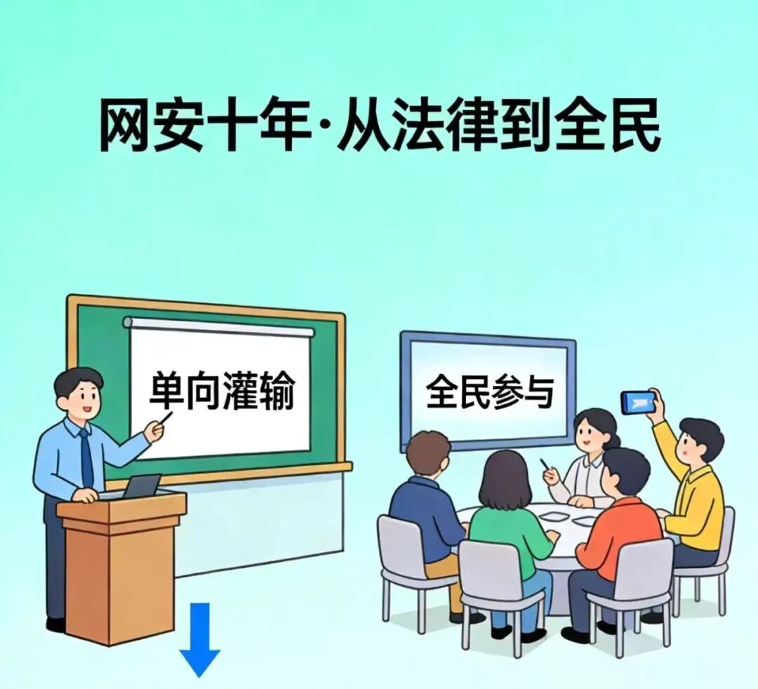 十年来,网络安全教育从单向宣传转向全民共建:机关严管数据保密,校园普及数字素养,社区开展科普宣讲,线上用情景剧、数字人等形式让安全知识深入人心。