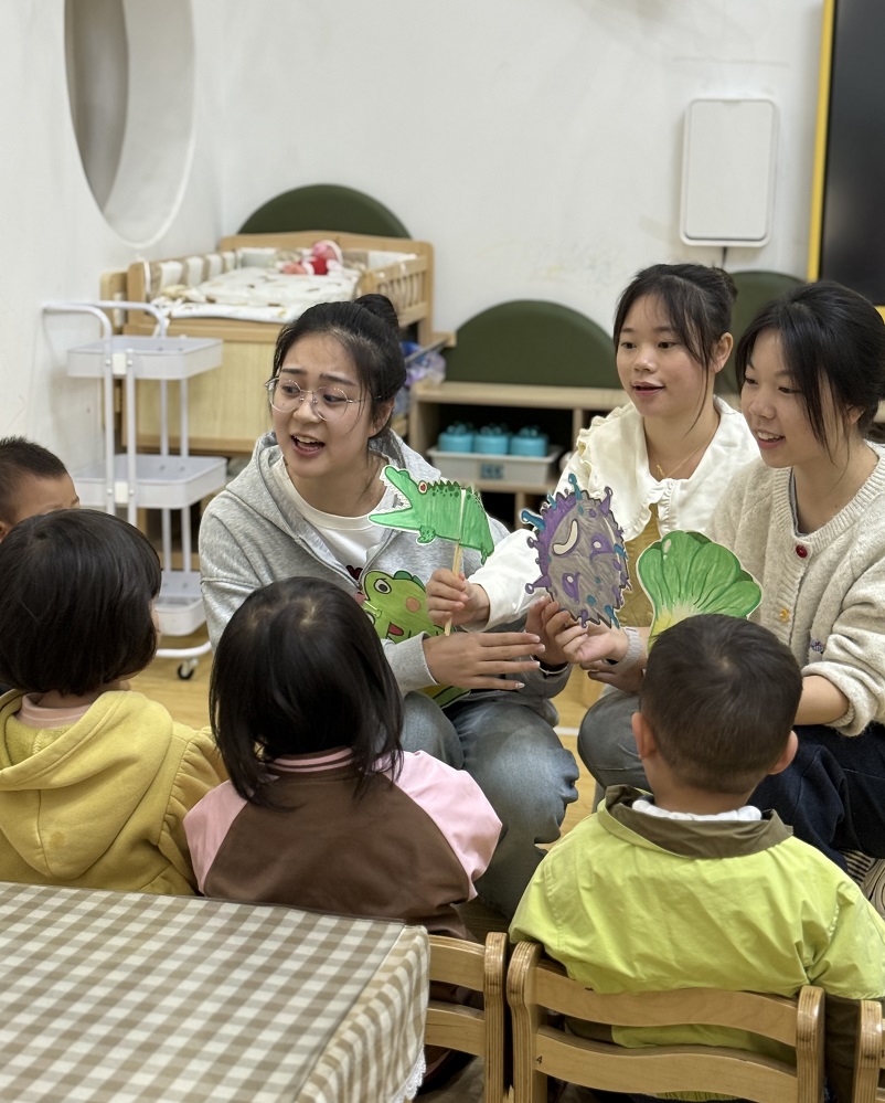 活动中最令托班老师们赞叹的,是托育专业学生们亲手制作的教具。仅《爱吃青菜的鳄鱼》一本,学生们就设计了“开口鳄鱼”、大开本自制绘本、食物卡片等多种方案。每套教具都充分考虑2-3岁幼儿的精细动作发展水平——操作简单、安全有趣。“做教具要站在孩子的能力水平上去设计,”参与制作的学生说,“我们学过《婴幼儿发展心理学》,知道这个年龄段孩子手部小肌肉还没发育完全,所以教具一定要好抓、好拿、好操作。”