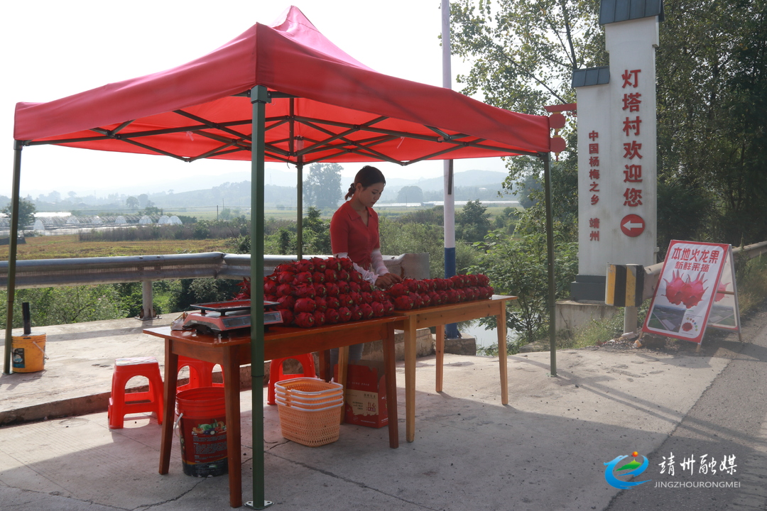火龙果采摘园位于G209国道旁灯塔村的入口处,沿着一条笔直宽阔的水泥路可直达。采摘园外的空地上停满了车辆,不时有游客三五成群前来体验采摘乐趣,他们牵着小孩、提着篮子兴高采烈地朝着火龙果大棚走去。