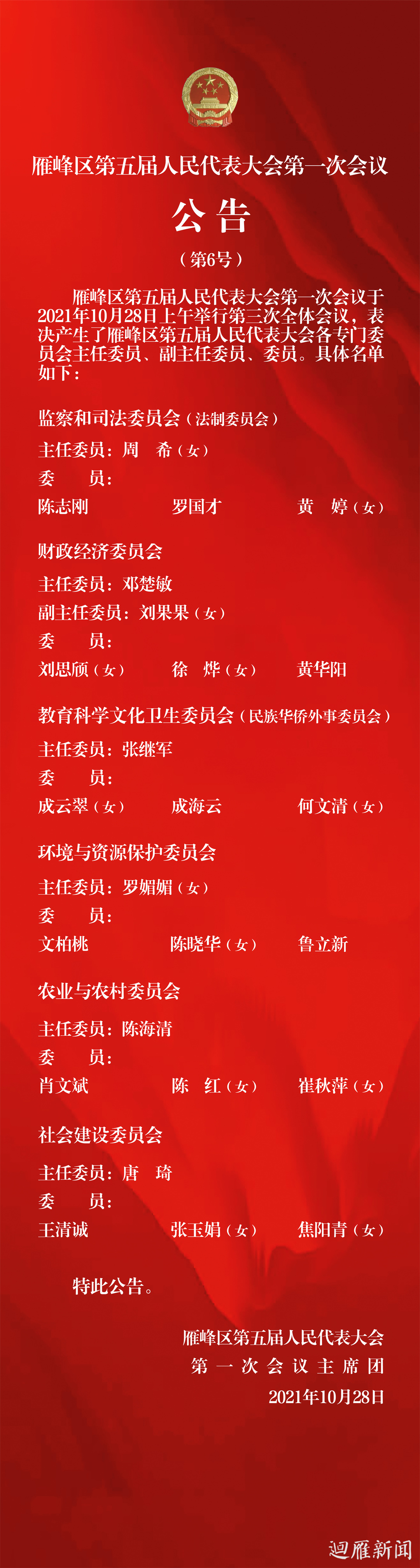 公告|雁峰区第五届人民代表大会各专门委员会主任委员、副主任委员、委员名单