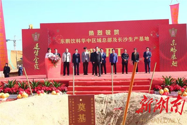 湖南日报·新湖南客户端11月9日讯(记者 张颐佳 通讯员 李双妍)今天上午,东鹏饮料华中区域总部及长沙生产基地项目开工奠基仪式在长沙金霞经开区举行。长沙市开福区委副书记、区长高伟宣布开工,金霞经开区党工委书记黎明,管委会主任朱江等领导共同为项目培土奠基。