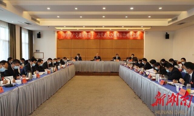 (11月25日下午,朱国贤同志来到他所在的省第十二次党代会湘西土家族苗族自治州代表团,与代表们一同讨论党代会报告。图为讨论现场。 湖南日报全媒体记者 赵持 摄)