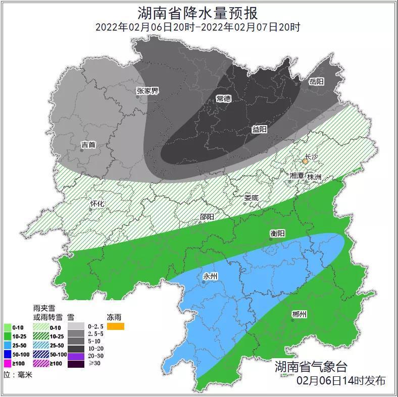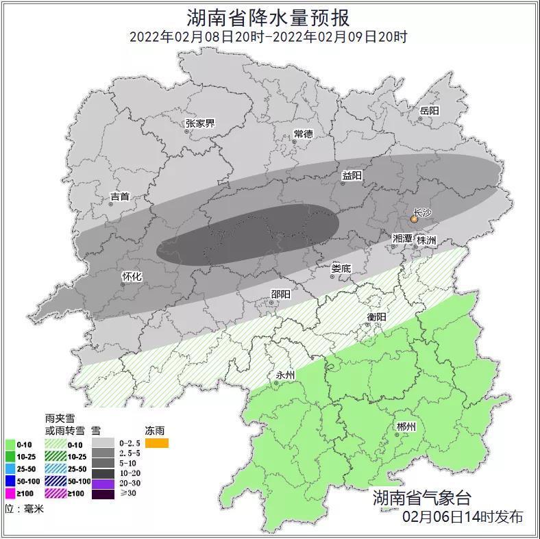 湖南省气象台预计,未来三天受高空槽、低空切变线及冷空气共同影响,省内有较强雨雪冰冻过程,6日晚和8日为最强降雪时段,湘中以北局地有暴雪,其他时段雨雪较弱,9日开始气温有所回升,省内大部分地区以降雨为主。