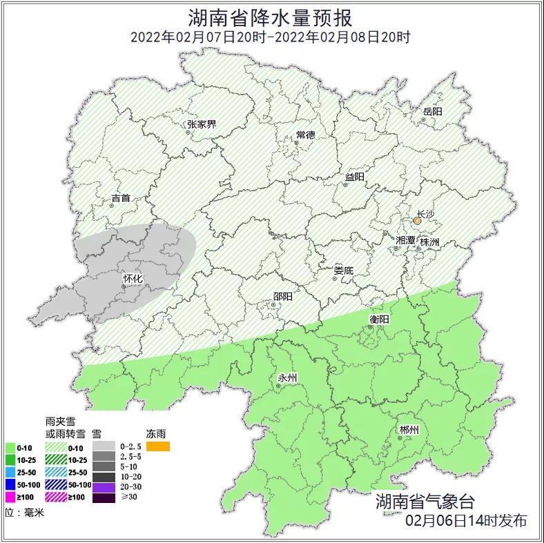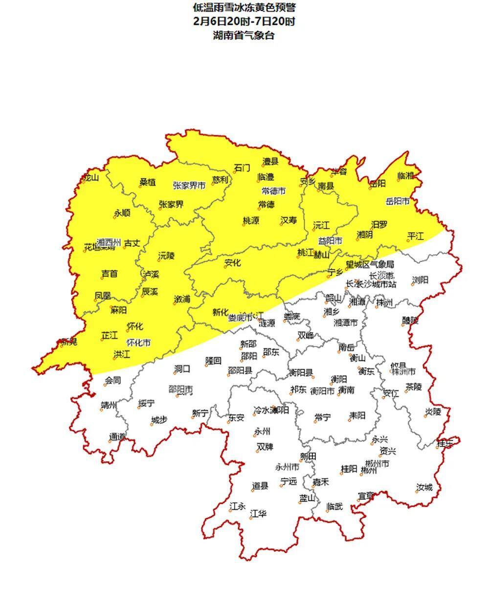 预计6日20时至7日20时,长沙西部、岳阳、常德、张家界、益阳、怀化、娄底、湘西州将出现雨凇或积雪,且局地最低气温≤0℃,请注意防范。