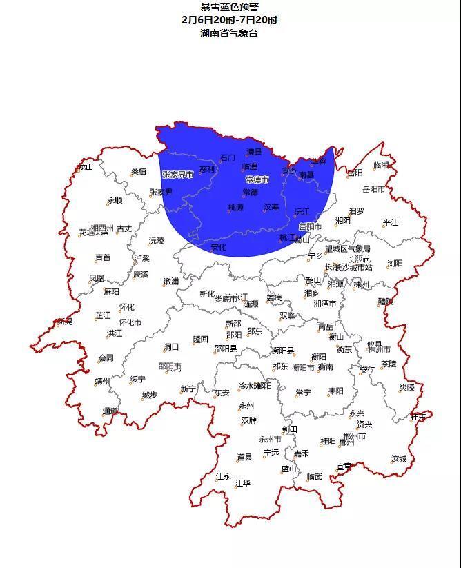 2月6日16时湖南省气象台发布暴雪蓝色预警、低温雨雪冰冻黄色预警,提醒公众加强防范。具体如下: