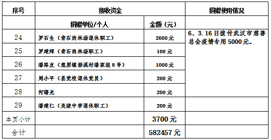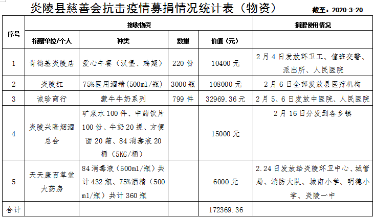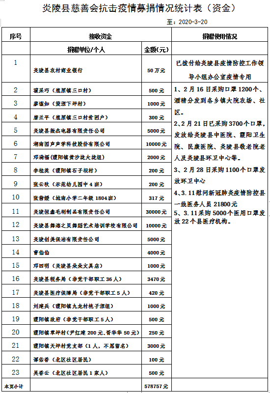 自2020年2月1日炎陵县慈善会向社会各界发起抗击新型冠状病毒感染的肺炎疫情募捐倡议以来,社会各界踊跃参与疫情捐赠,捐款捐物。截止3月20日止,累计接受捐赠资金582457.00元,捐赠物资价值172369.36元。根据县疫情防控工作领导小组的统筹安排,现将捐赠情况及使用情况向社会公布如下(见附表):