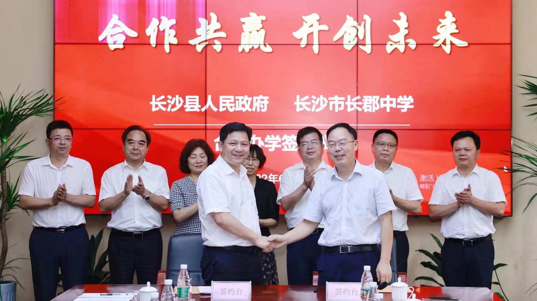 6月24日下午,长沙县人民政府与长沙市长郡中学举行合作办学签约仪式,将由长郡教育集团统一调派学校领导、统一管理标准、统一教学计划、统一教学评价、统一教学资源,共同建设长郡自贸临空高级中学,助推长沙县教育高质量发展。长沙县委副书记、县长陈永高出席并讲话。长沙市政府副秘书长王新良、长沙市教育局党委书记、局长孙传贵出席,区县领导常利民、邱友梅、魏检参加。