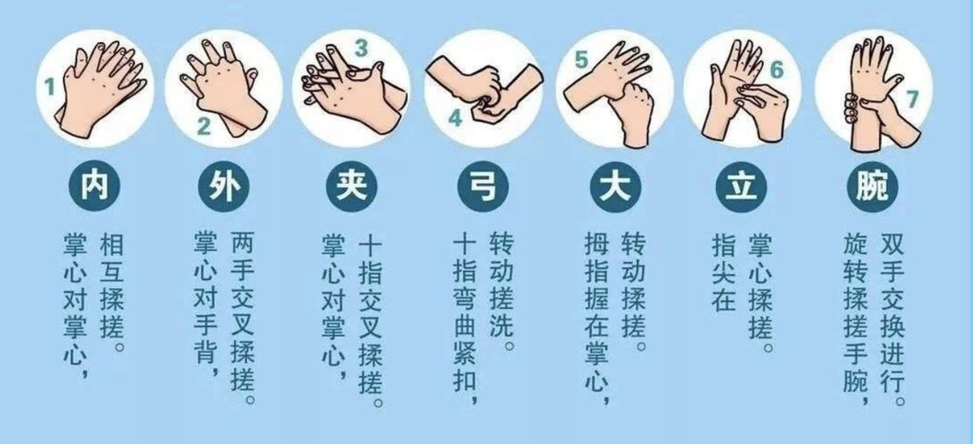 在餐前便后、外出归来、使用体育器材、接触公用物品或污染物品后,以及触摸眼口鼻部位前,应进行洗手或手消毒处理。一般可采用简易洗手法,即用流动水冲洗10秒,也可采取七步洗手法。