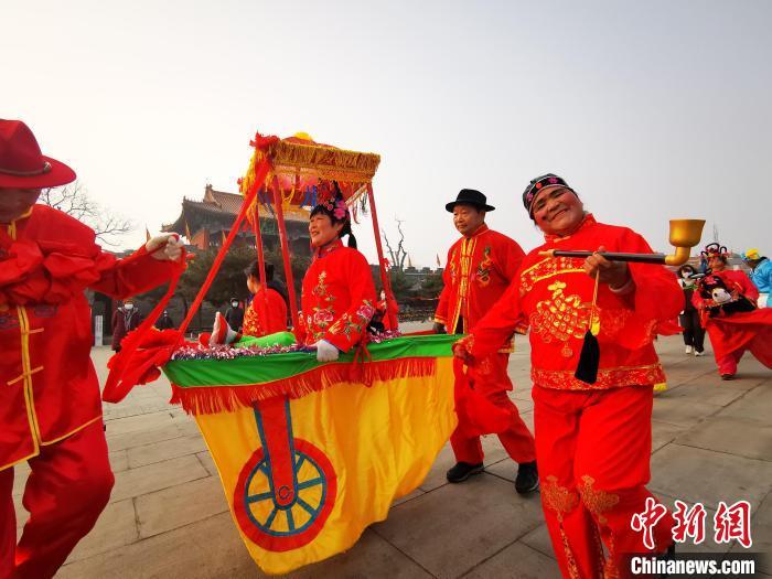 资料图:泰安岱庙广场举办舞龙、舞狮、踩高翘民俗活动庆元宵。 刘水 摄