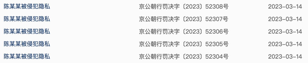 北京市公安局公开消息显示,北京31岁男子邓某某伙同他人在北京通州区通过信息网络散布陈某某个人隐私,被警方给予行政拘留5日的行政处罚。此外,还有张某某、丁某、许某某、端某某等4人被警方给予行政拘留处罚。具体内容如下:!/ignore-error/1&pid=19713808)