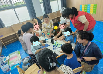 志愿者们带领小朋友们体验神奇的科学小实验。漂浮的鸡蛋、不会掉的乒乓球及烧不破的气球三个简单的小实验引起了小朋友们的兴趣,所有孩子全神贯注地观看着一个个神奇的科学小实验,并积极与志愿者互动,参与到科学探究的过程中来,在实验过程小朋友们充分体会到了科学实验的魅力,以及科学探究带来的快乐。试验结束小朋友们马上又踏入了手工制作和烘焙之旅,可爱的手工作品和美味的披萨从他们手中一一诞生。