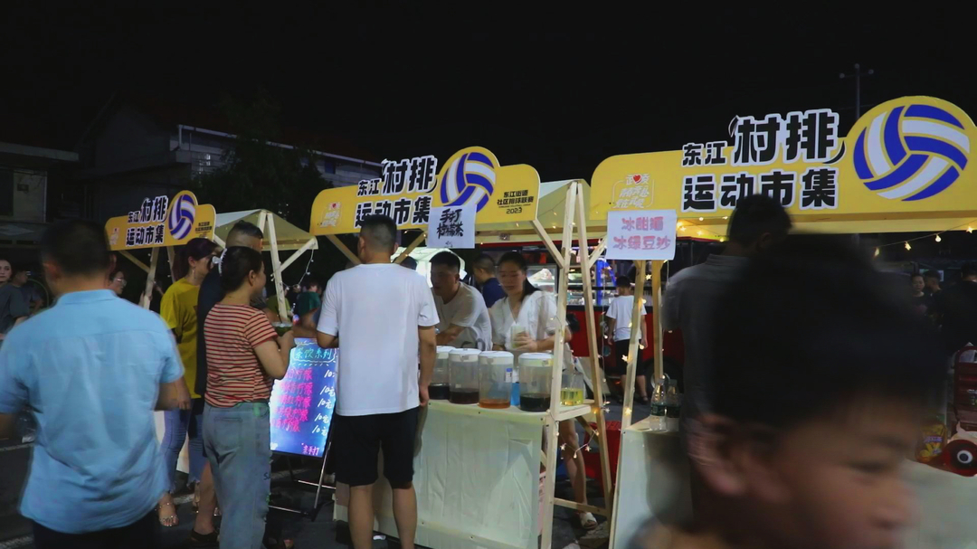 “村排”聚集了人气,就有了“烟火气”,球场旁的夜市同样热闹非凡,每天的比赛吸引了很多商家前来“淘金”,同时,不少年轻人也谋划起了返乡创业之路。球场带来了市场,也点亮了东江的夜经济。