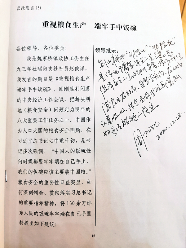 对赵俊洋委员《重视粮食生产 端牢手中饭碗》的议政发言,周玉凡批示:制止耕地“非农化”“非粮化”是保证粮食安全的关键。赵俊洋委员的建议切中要害,操作性强。请农业农村局、自然资源局、发改局认真吸收,结合当前专项部署抓好各项措施的落实。
