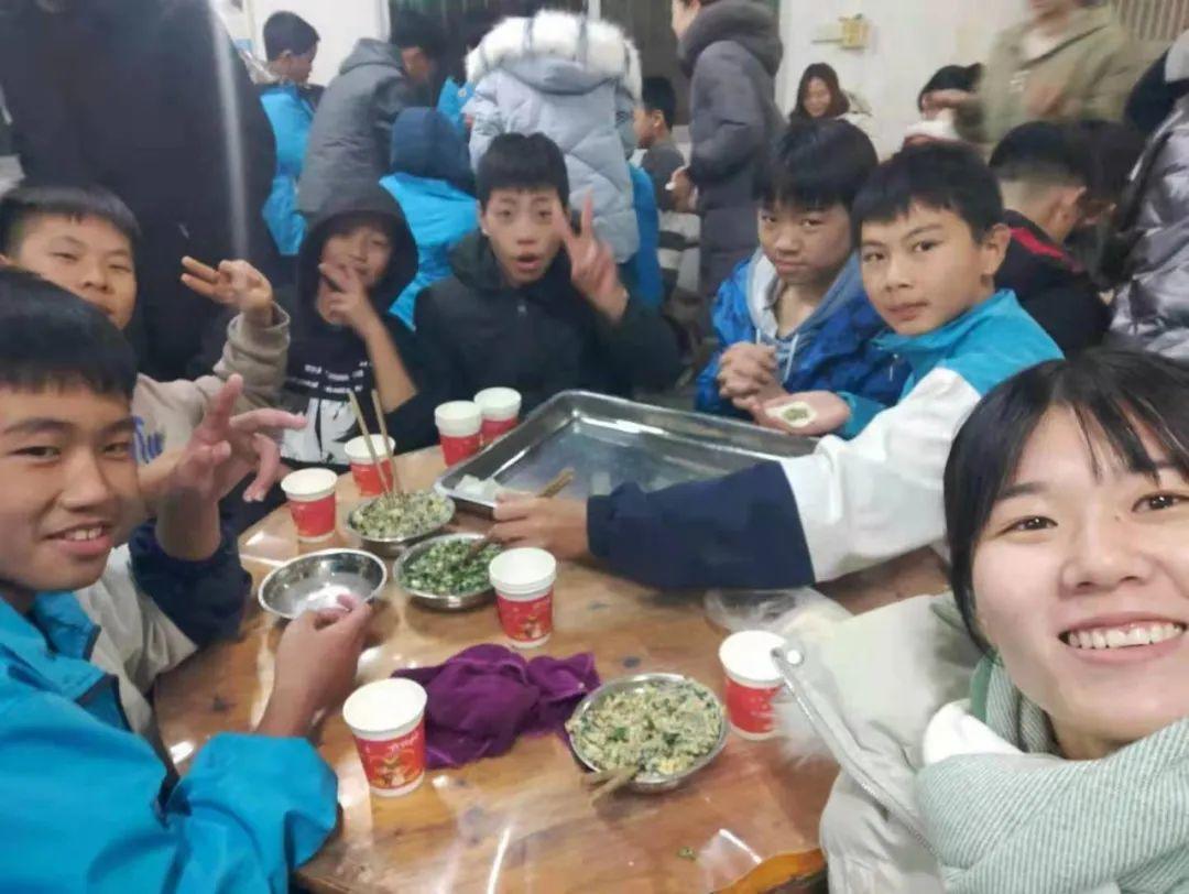 工友们早就烧开了水,等待寄宿生们将饺子送到厨房下锅。一会儿,热气腾腾的饺子出锅了,工友们将出锅的饺子端上桌,寄宿生们吃着自己包的饺子,脸上洋溢着幸福的笑容,整个大家庭里显得格外温馨。