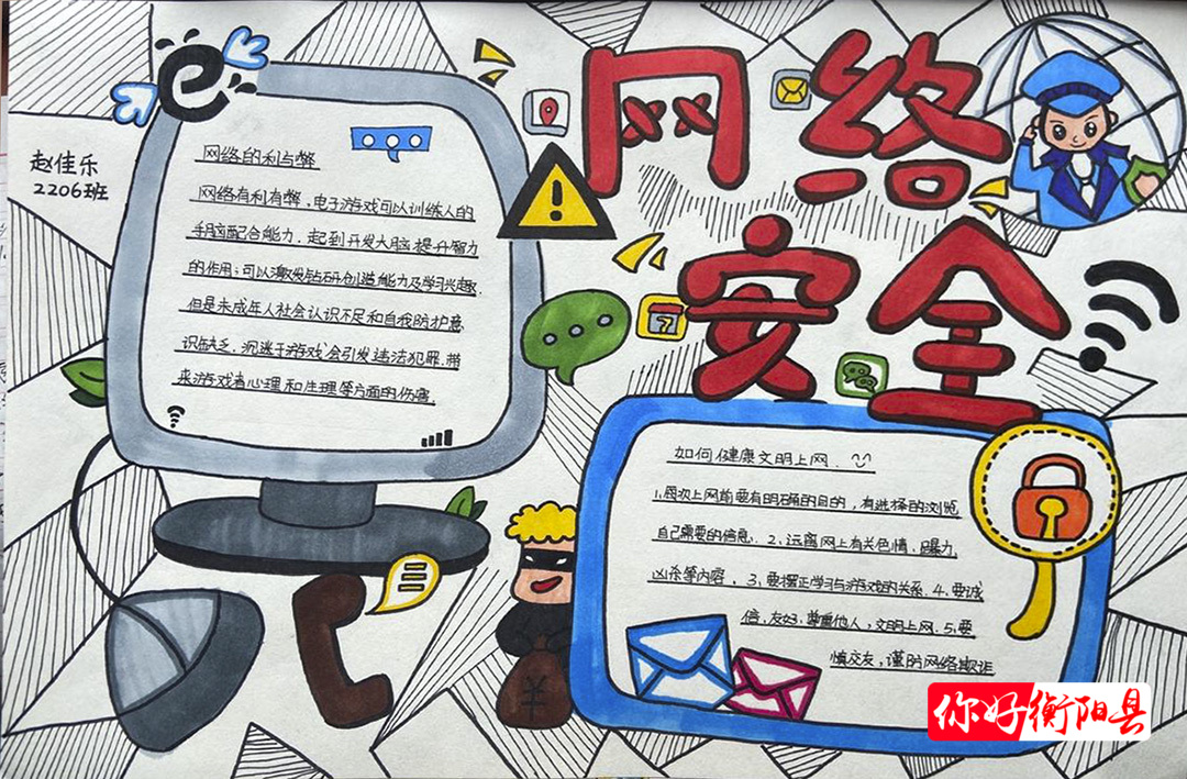 面对日益严峻复杂的网络安全形势,青少年网络成瘾、网络犯罪等案例时有发生,给青少年牢固树立正确的网络安全观势在必行,通过本次手抄报比赛活动,让同学们对如何文明上网,如何维护网络安全,有了更深刻的认识。