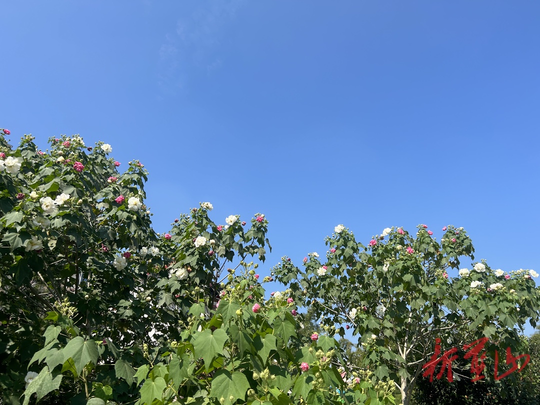湖南日报•新湖南客户端10月25日讯(通讯员 李季)金秋十月,蓝山县舜水河沿河风光带的木芙蓉已伴着秋意翩然盛放,成片绿叶上随风摇曳着繁花,灼灼其华、清丽如斯,令人陶醉,呈现一幅美不胜收的秋景图。