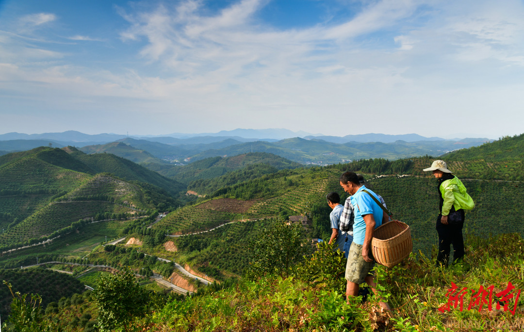 一排排油茶树,织成一条条绿色地毯,沿着地势自然起伏……金秋时节,登上耒阳市东湖圩镇汤泉村海拔400多米的油茶基地,入眼皆青翠,绿意沁心脾。5000亩高山油茶生态园,点上成荫、面上成景。