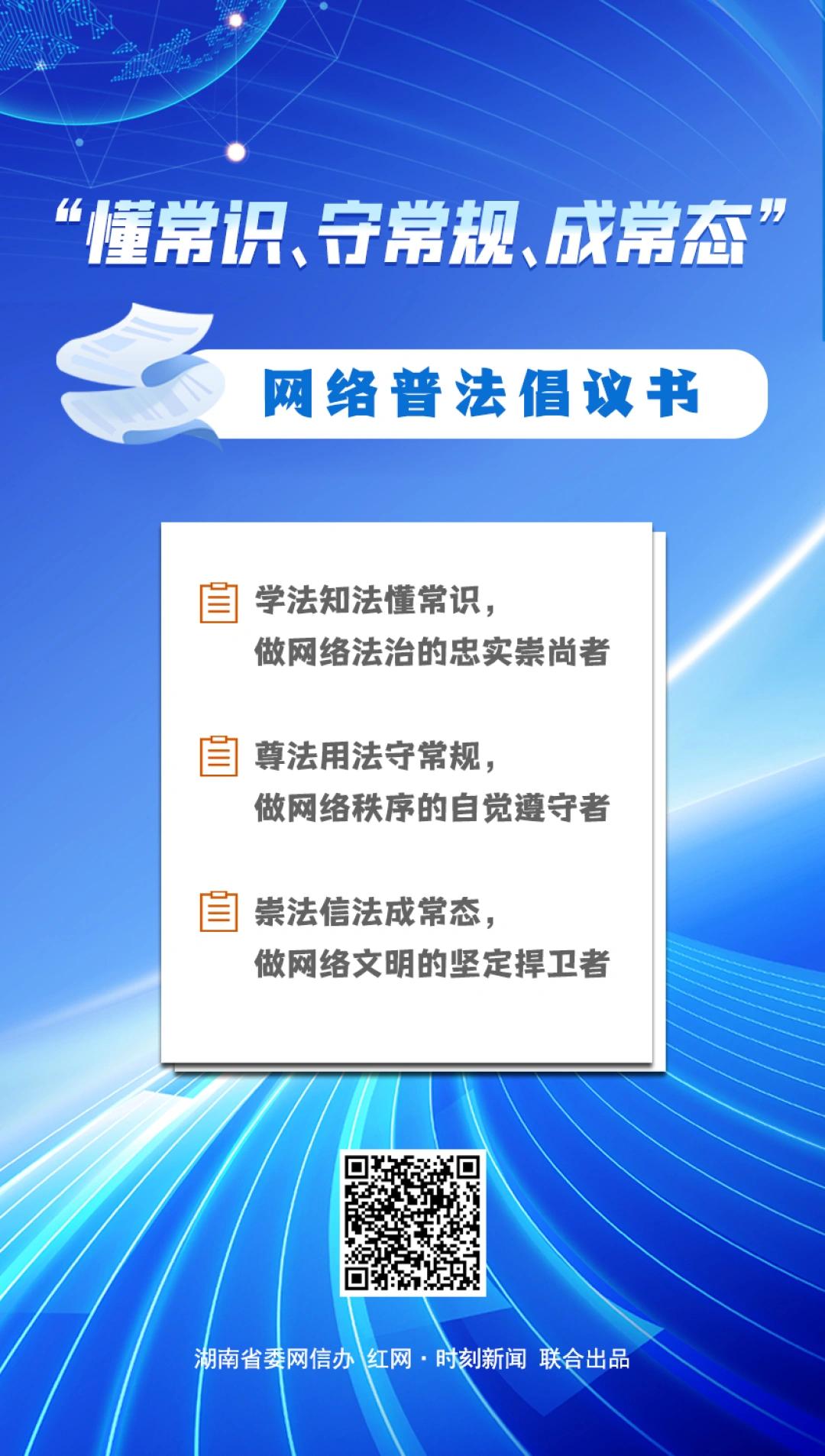 各位亲爱的网民朋友,众智之所举无不胜也,众力之所为无不成也。让我们共同行动起来,学法知法、尊法用法、崇法信法,懂法律常识、守底线常规、成文明常态,让法治信仰在三湘大地蓬勃生长,让文明之花在互联网上盛情绽放!