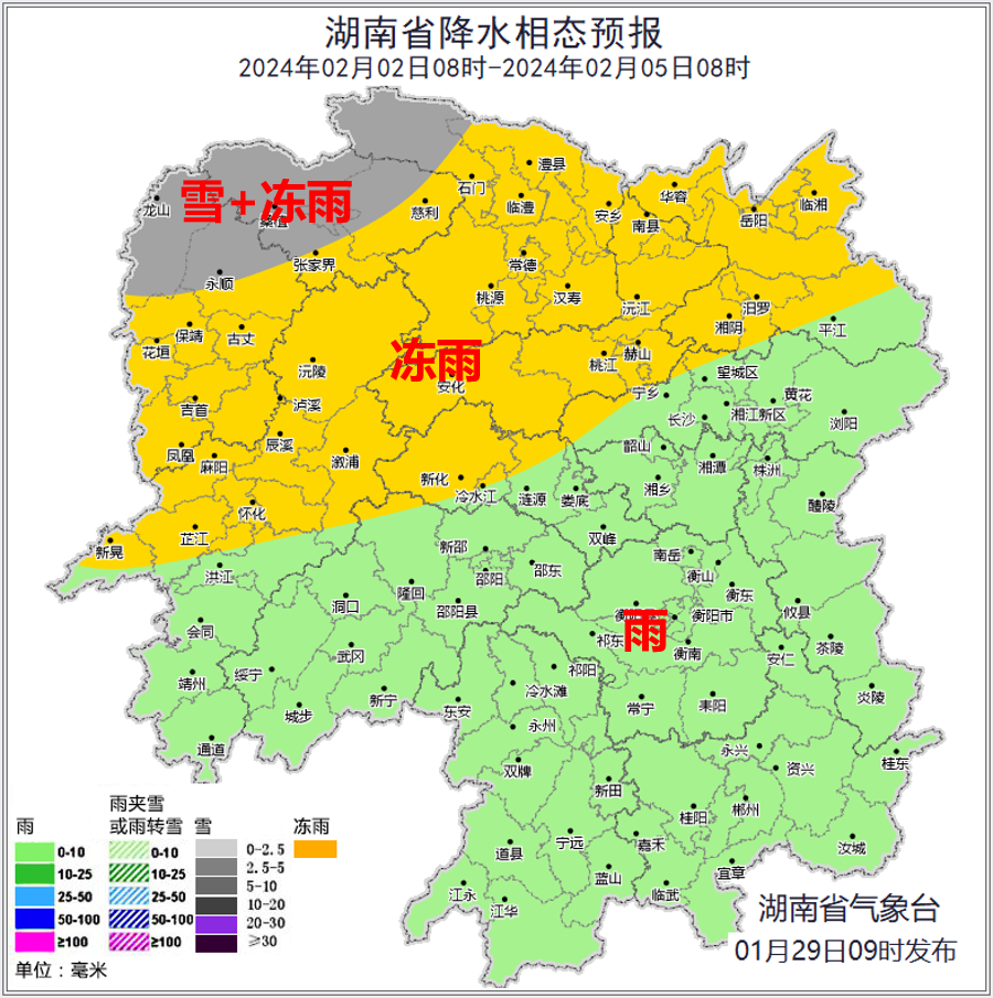 未来一周天气特点 冻雨明显,持续时间长。 2日至4日湘北有持续性冻雨,电线覆冰厚度5~10毫米,高海拔地区局地可达20毫米左右。 湖南降水相态预报图(2月2日08时至2月5日08时) 雨雪相态复杂。 29日至2月1日以降雨为主,2日至4日湘北将出现冻雨、雨夹雪、纯雪。 累计雨量大。 29日至2月4日全省累计降水量普遍为30~60毫米,岳阳、益阳北部等地70~100毫米,较常年同期偏多3~5倍。 湖南累计降水量预报图(1月29日08时至2月5日08时)