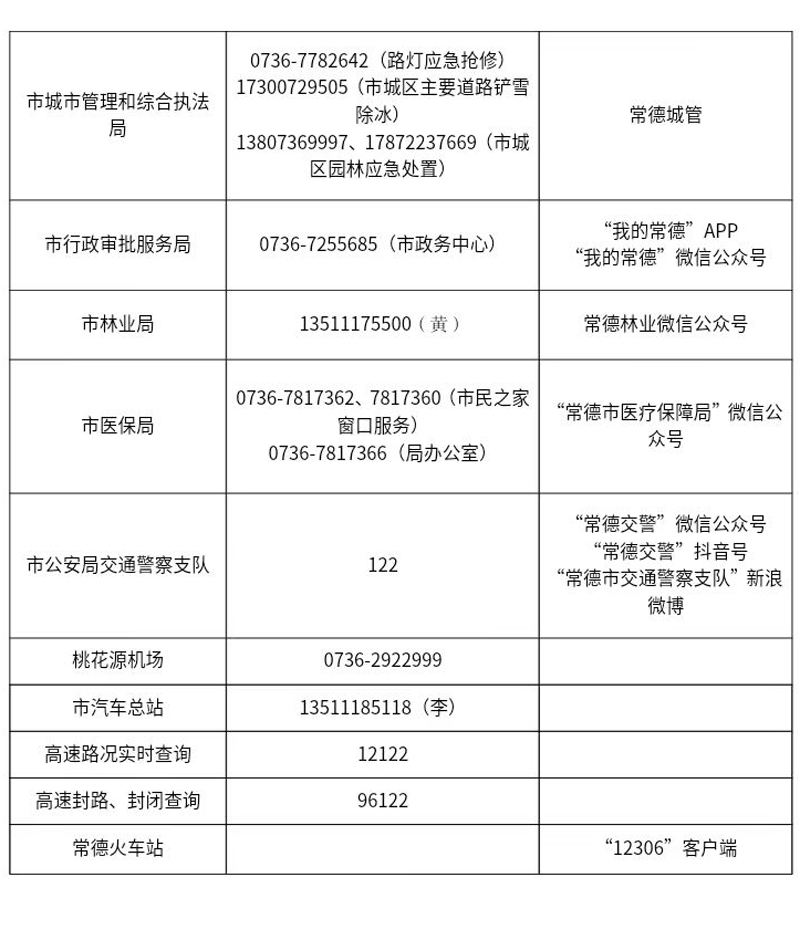 面对当前全市低温雨雪冰冻天气严峻形势,为应对雨雪冰冻天气、保障服务民生,有力保障群众人身安全,现向社会各界公布全市有关部门便民服务电话。