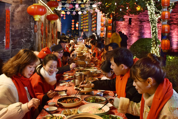 洪江市黔阳古城,1000余名当地居民和游客共尝长龙宴,迎接龙年春节到来。杨锡建 李林 摄