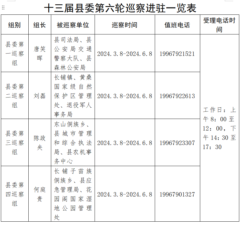 为确保本轮巡察工作深入开展,县委第一至第四巡察组均设置专门值班电话和征求意见箱,号码分别为:19967921521、19967922613、19967923307、19967901327。受理电话的时间为上午8:00至12:00,下午15:00至18:00。主要受理反映被巡察党组织领导班子及其成员和下一级党组织主要负责人的来信、来电、来访,重点是落实全面从严治党主体责任和监督责任,执行党的政治纪律、组织纪律、廉洁纪律、群众纪律、工作纪律、生活纪律等方面的举报和反映。其他不属于巡察受理范围的信访问题,将按规定由有关部门认真处理。